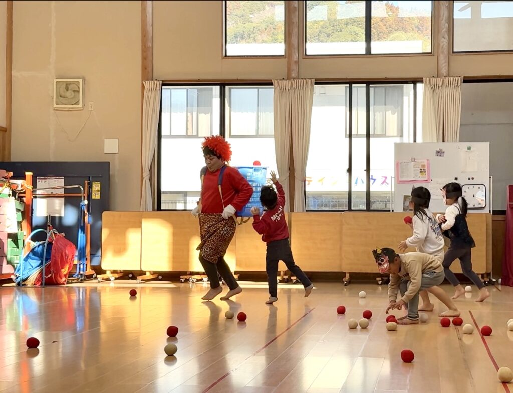 鬼が背負っているカゴに玉を入れるゲームをしました✨