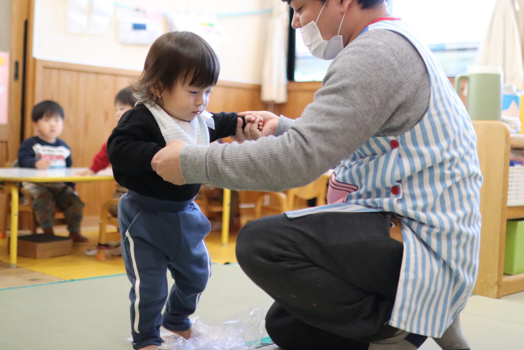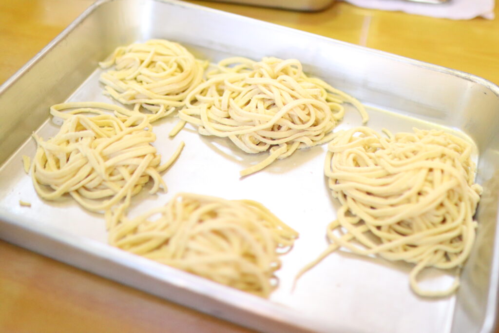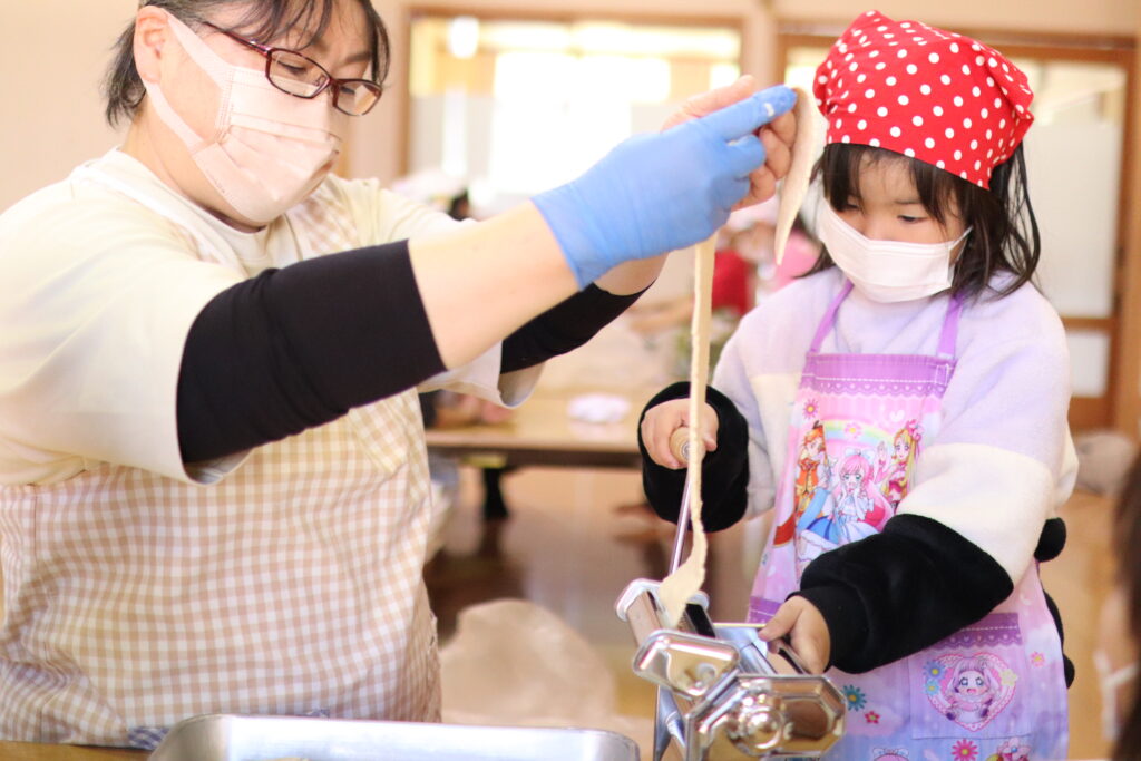 生地をビニール袋に入れ「おいしくな~れ!」と足でふみふみ✨ 生地が出来上がった後は器具を使って伸ばしてカットしたらうどん麺の完成😆